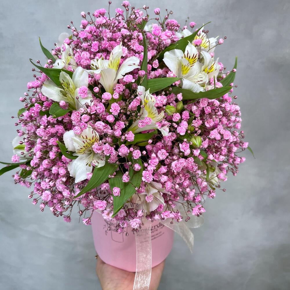 Альстромерия – 5 шт.Гипсофила розовая – 3 шт.Коробка d12 – 1 шт.Оазис – 1 шт.
