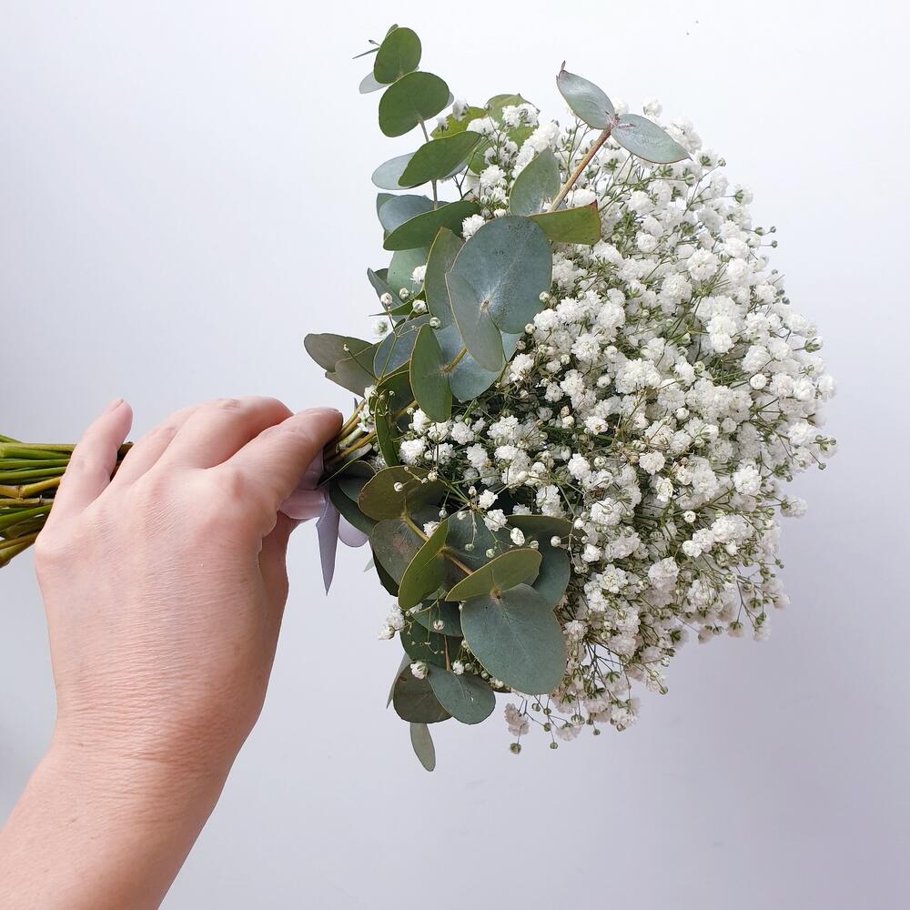 Лента атласная – 10 шт.Эвкалипт Baby Blue – 5 шт.Булавка с бусами – 1 шт.гипсофила белая – 15 шт.