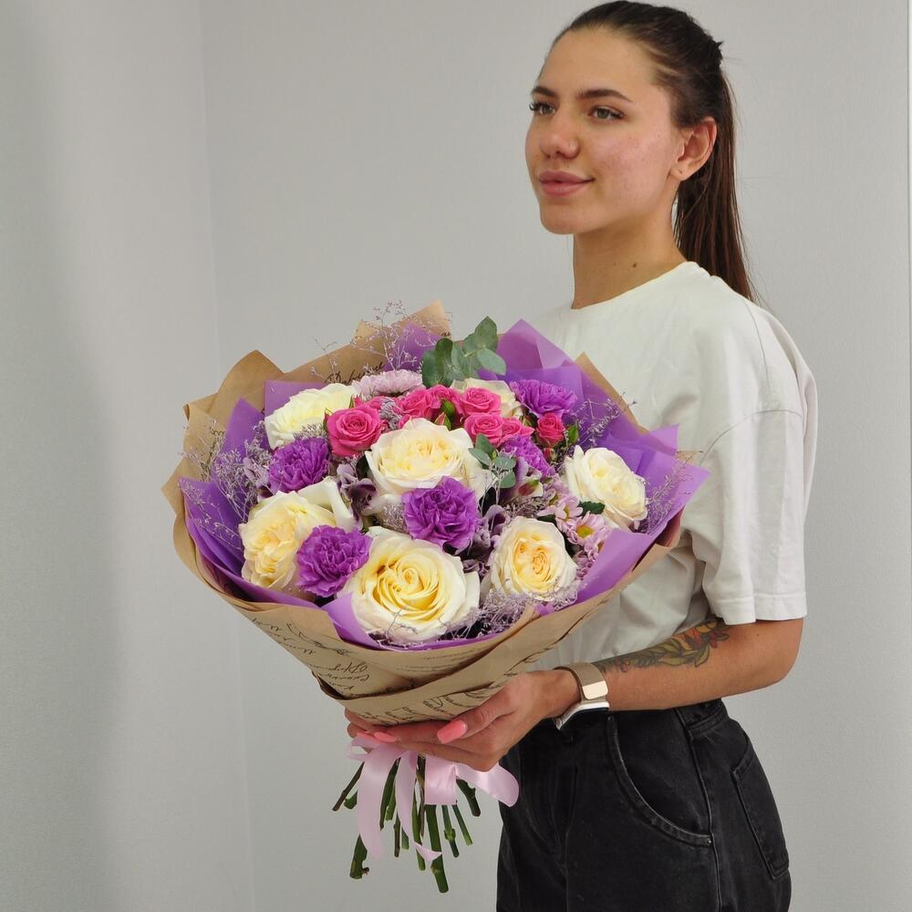 Альстромерия – 2 шт.Роза кустовая – 1 шт.Эвкалипт – 1 шт.Лента атласная – 1 шт.Диантус – 5 шт.Сантини – 2 шт.Крафт – 1 шт.Роза белая пионовидная – 7 шт.Кермек – 1 шт.Пленка матовая – 1 шт.