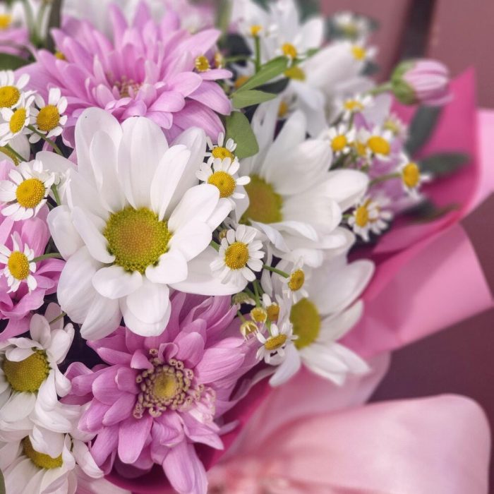Хризантема кустовая – 3 шт.Лента атласная – 1 шт.Коробка шляпная – 1 шт.Ромашка кустовая – 2 шт.Открыточка с вашими пожеланиями – 1 шт.тесьма кружево – 1 шт.шоколад ферреро – 1 шт.любовь флориста (бесплатно) – 1 шт.