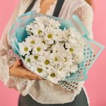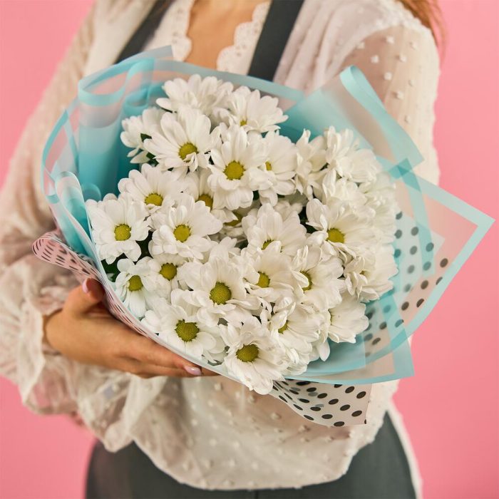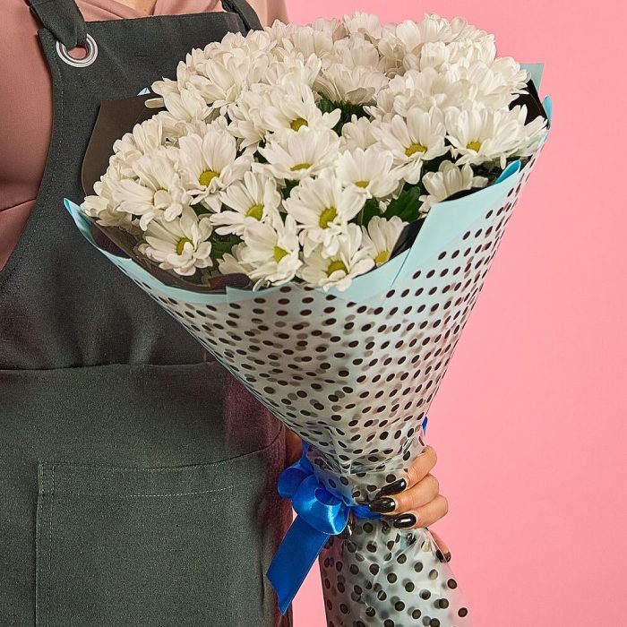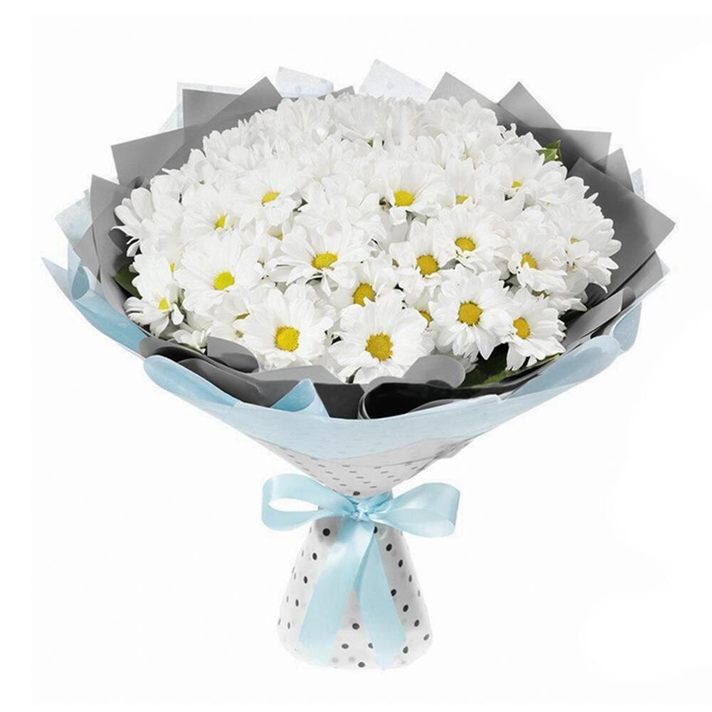 хризантема кустовая (белый) – 11 шт.пленка цветная – 1 шт.лента атласная (синий) – 1 шт.