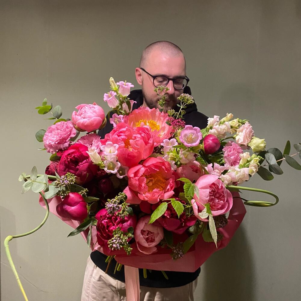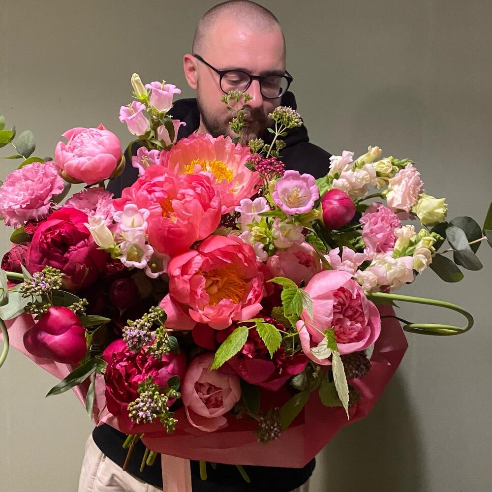 Лизиантус – 3 шт.Пион – 13 шт.Эвкалипт – 5 шт.Упаковка – 1 шт.Малина – 3 шт.Львиный зев – 3 шт.Травы – 7 шт.Колокольчик – 2 шт.