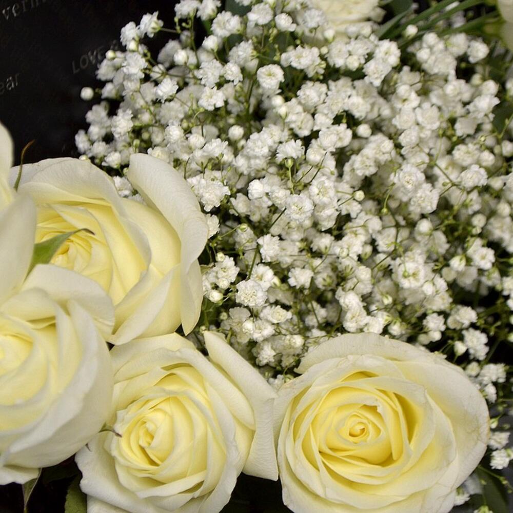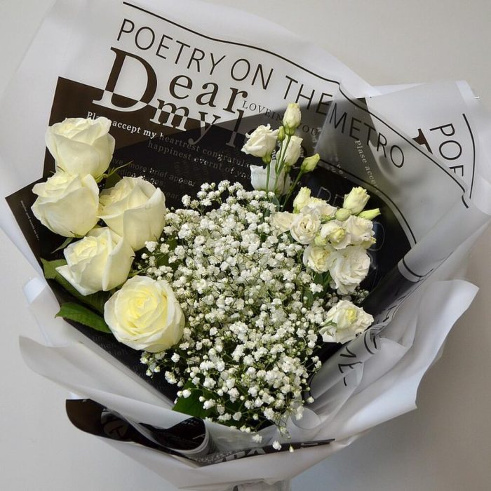 Красивый и стильный подарочный букет с белыми розами, гипсофилой и лизиантусом в оригинальной упаковке.Размеры букета: ширина 55 см, высота 60 см.В составе букета: эквадорские розы- 5 шт., гипсофила – 6 шт., лизиантус – 3, стильное оформление букета.