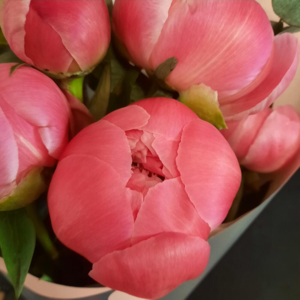 Пионы Коралл Шарм 11 шт с эвкалиптом