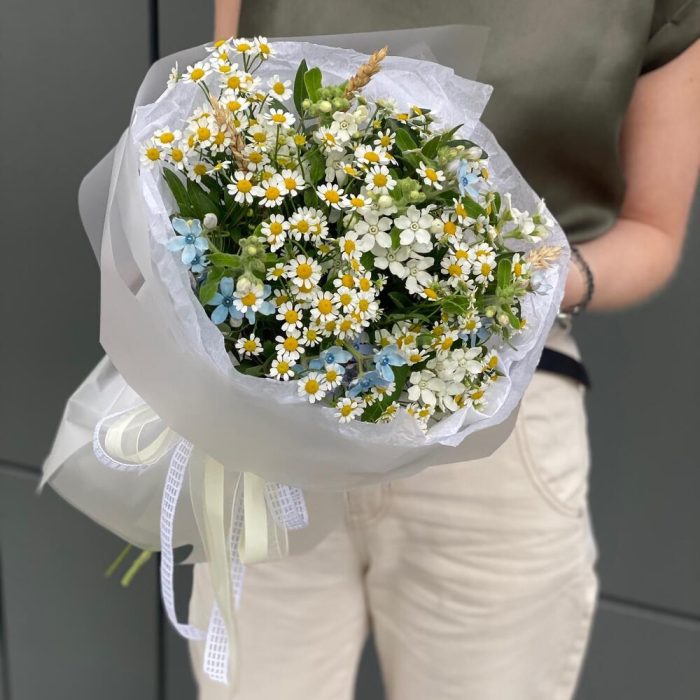 Букет из полевой ромашки и цветков оксипеталума с добавлением колосков в оформлении!