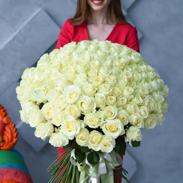 Роскошный букет из 201 белой розы, перевязанный атласной лентой с большим красивым бантом, подойдёт когда ваши чувства не знаю границ!