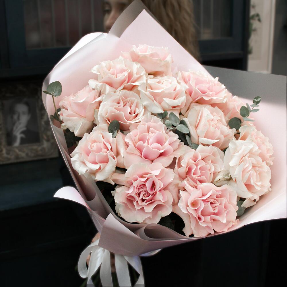 Эвкалипт – 2 шт.Атласная лента – 2 шт.Французская роза – 15 шт.Матовая пленка – 3 шт.