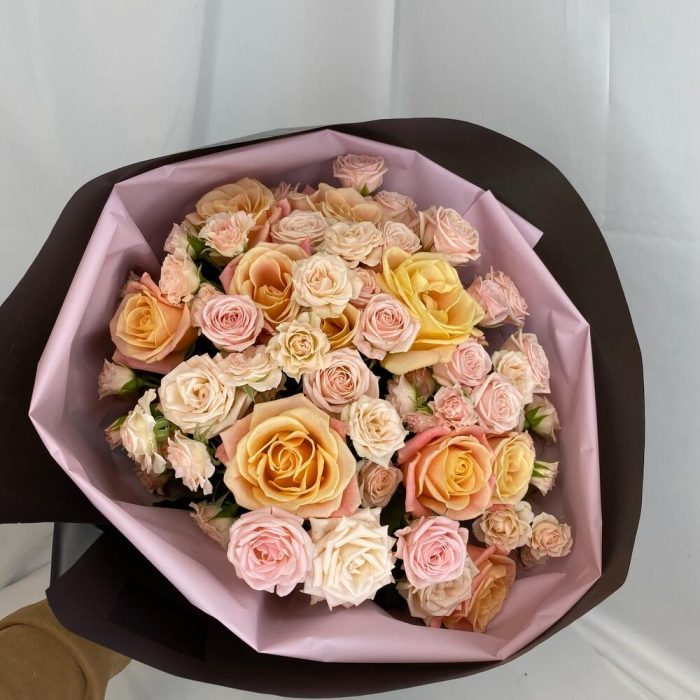 Кустовая роза – 19 шт.Одноголовая роза – 10 шт.Упаковка дизайнерская – 3 шт.Атласная лента – 1 шт.