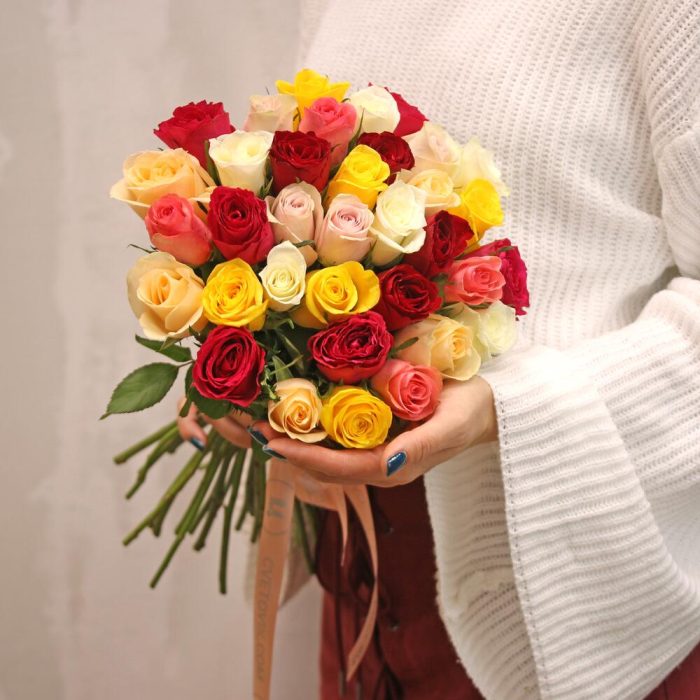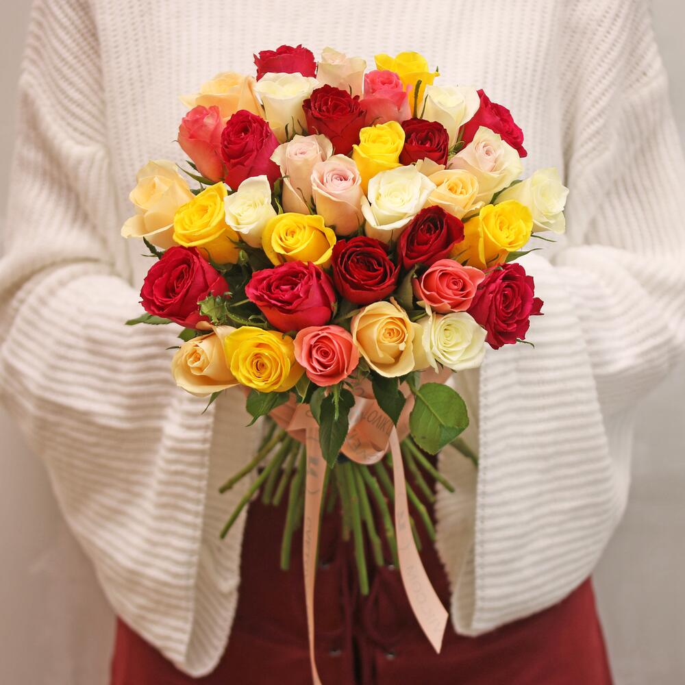 Букет из 35 роз микс 35-40 см (Кения) под атласную ленту