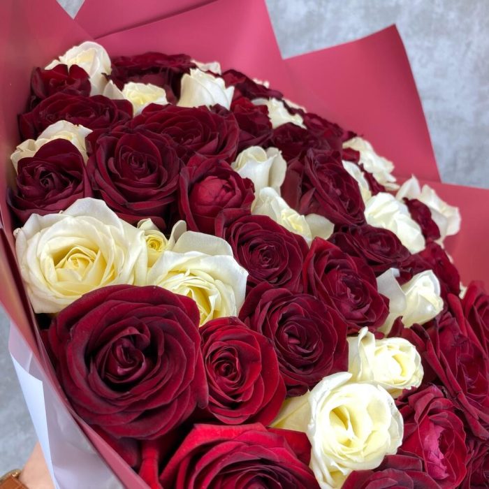 Роза красная – 38 шт.Роза белая – 21 шт.Упаковка – 3 шт.Атласная лента – 1 шт.