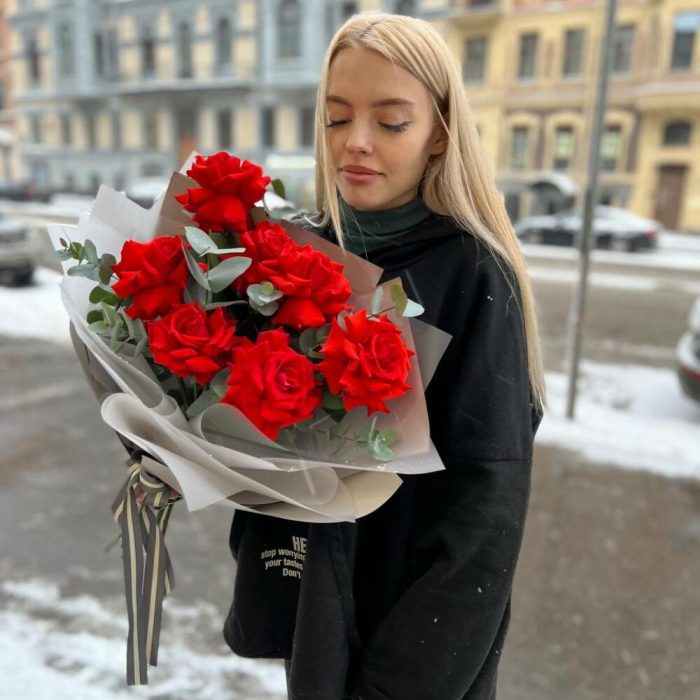 Роза Нина – 7 шт.Эвкалипт – 3 шт.Пленка матовая – 2 шт.Пленка дизайнерская – 2 шт.Лента атласная – 1 шт.