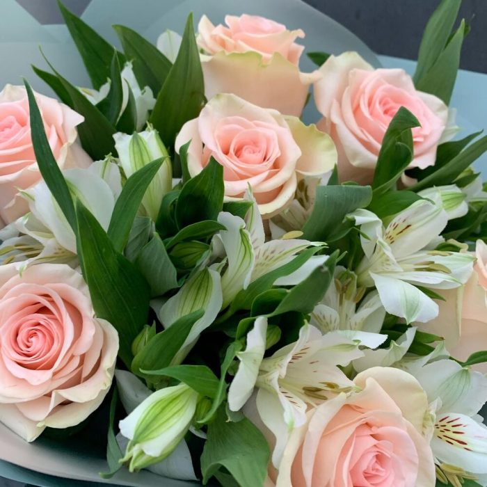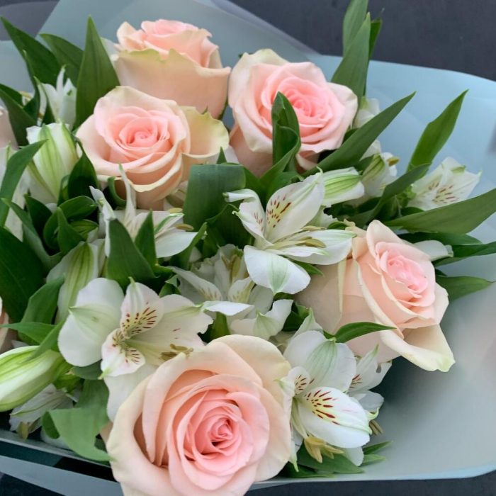 Роза – 7 шт.Альстромерия – 8 шт.Упаковка дизайнерская – 1 шт.