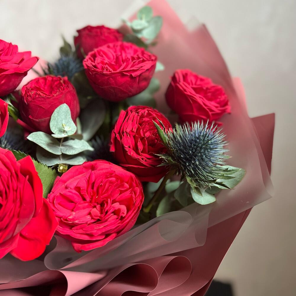 кустовая роза piano – 9 шт.эрингтум – 1 шт.Эвкалипт – 2 шт.декоративная упаковка – 1 шт.Атласная лента – 1 шт.