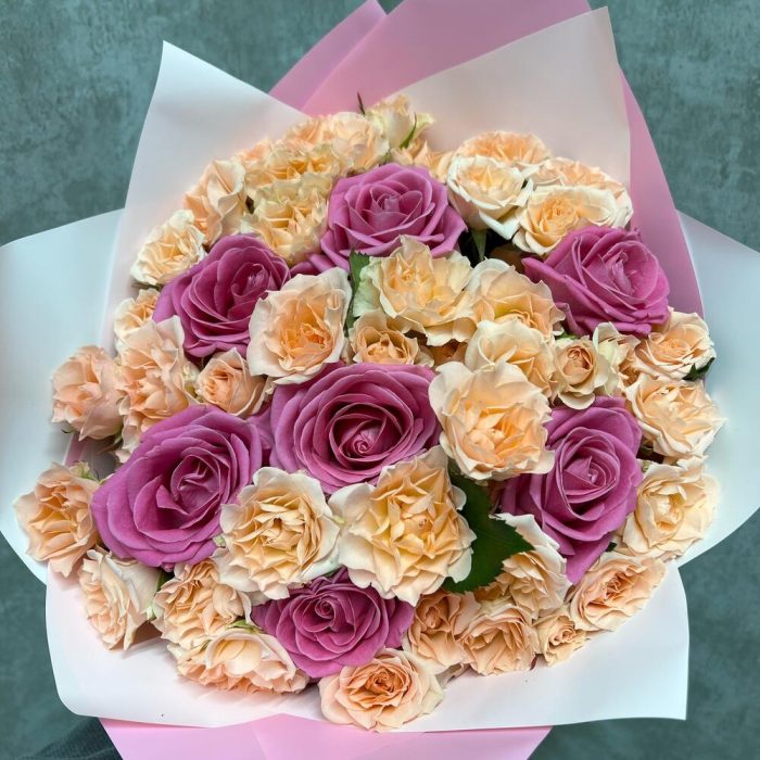 Лента – 1 шт.Роза аква – 7 шт.Дизайнерская упаковка – 1 шт.роза кустовая ариони – 20 шт.