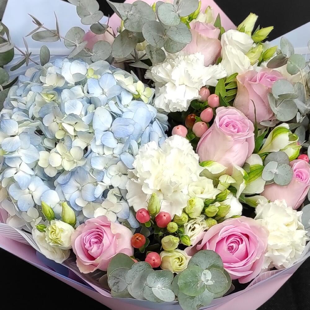 Гортензия – 1 шт.Роза – 7 шт.Диантус – 5 шт.Эустома – 2 шт.Гиперикум – 3 шт.Эвкалипт – 2 шт.Фисташка – 1 шт.Дизайнерская упаковка – 3 шт.Альстромерия – 2 шт.