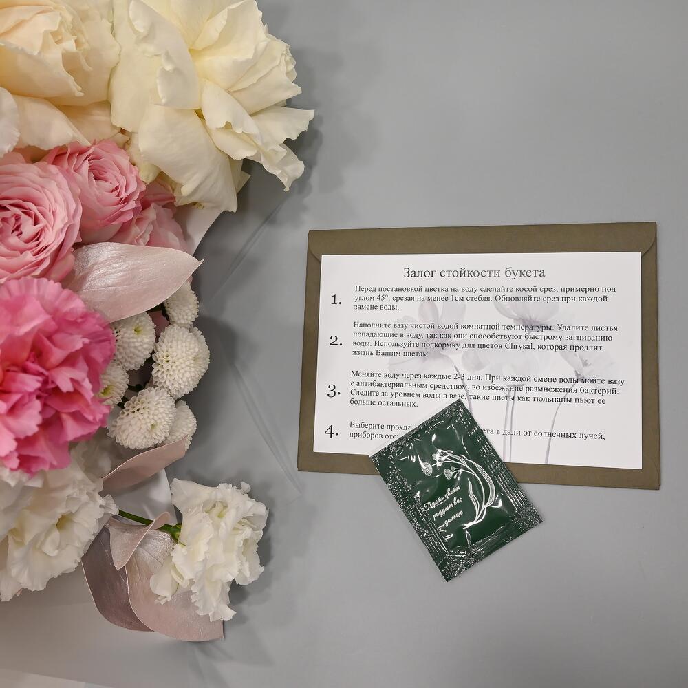 - Сроки возврата: Претензии по качеству букета принимаются в течение 24 часов с момента его получения.