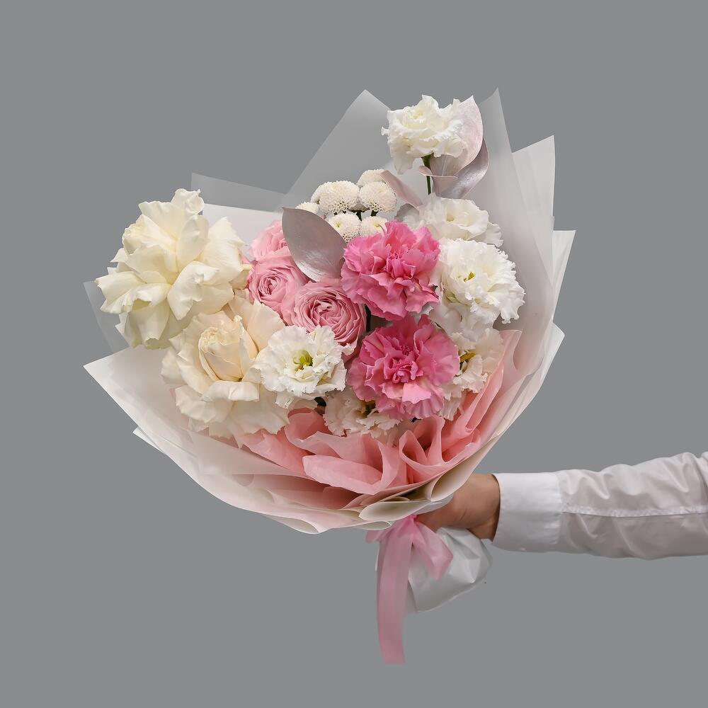 Французская роза – 2 шт.Гвоздика – 2 шт.Сантини – 1 шт.Рускус – 2 шт.Роза кустовая пионовидная – 1 шт.эустома белая – 2 шт.Упаковка дизайнерская – 2 шт.
