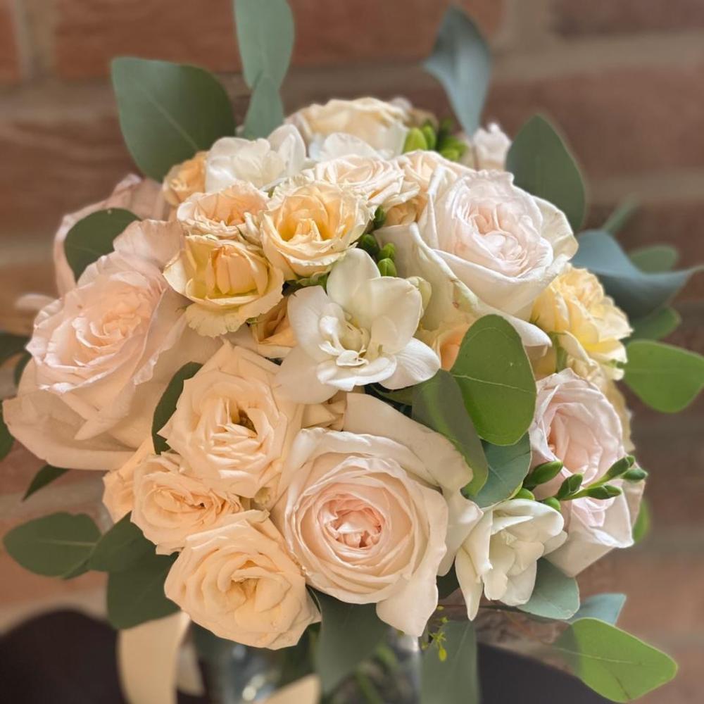 Эвкалипт Популус – 2 шт.Лента атласная – 1 шт.Фрезия белая – 5 шт.кустовая роза кения кремовая – 6 шт.роза white o’hara – 7 шт.