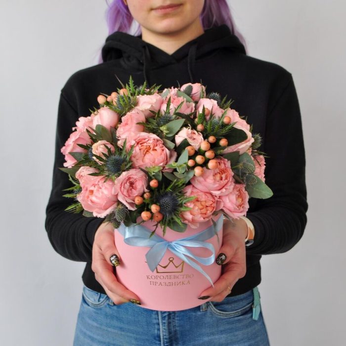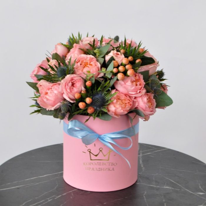 Гиперикум – 5 шт.Лента – 1 шт.Эвкалипт – 1 шт.Эрингиум – 5 шт.Коробка шляпная – 1 шт.Роза кустовая джульетта – 9 шт.