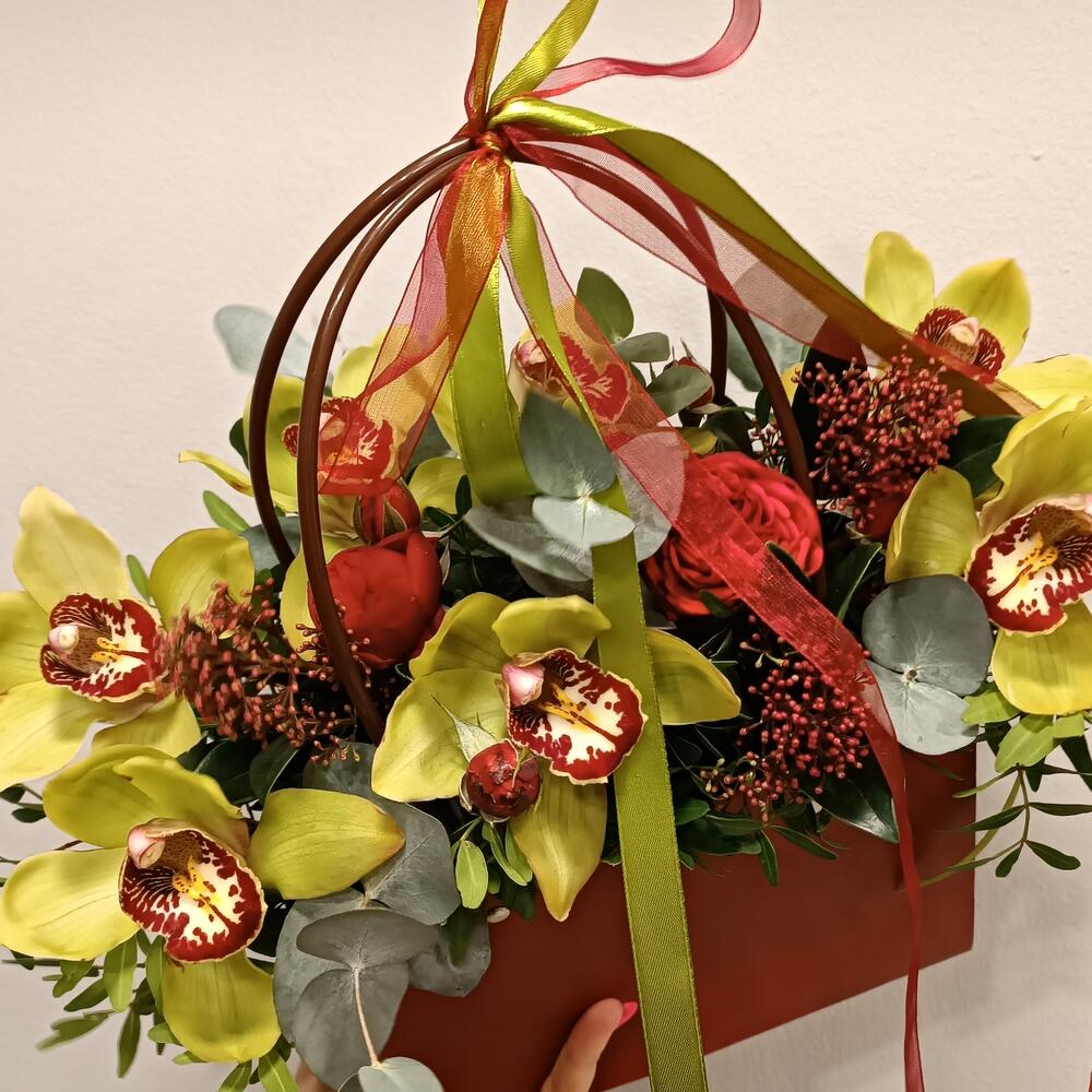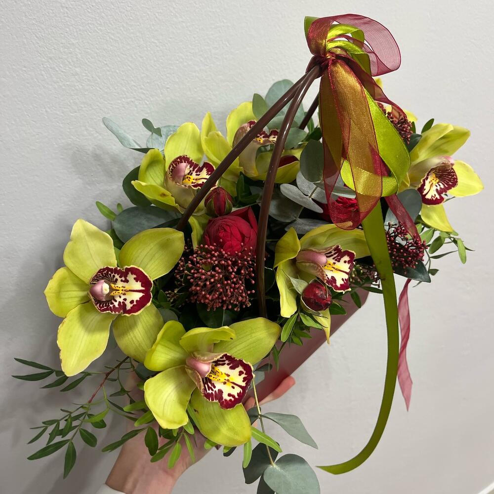 Писташ – 3 шт. Эвкалипт – 3 шт. Лента атласная – 1 шт. Скиммия – 3 шт. ЦИМБИДИУМ – 7 шт. Сумочка – 1 шт. Лента органза – 1 шт. биофлор – 1 шт. роза ред пиана пионовидная – 2 шт.