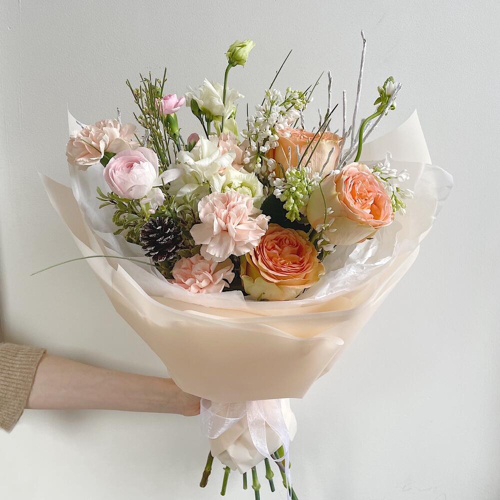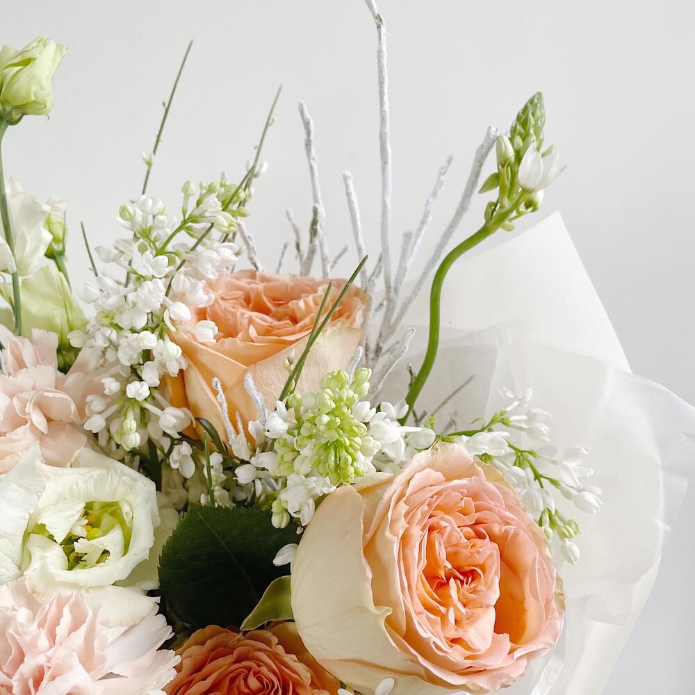 Лизиантус – 1 шт.Питтоспорум – 1 шт.Сирень – 1 шт.Роза – 3 шт.Орнитогалум – 1 шт.Ранункулюс – 1 шт.Шишка – 1 шт.Упаковка дизайнерская – 1 шт.Черничник – 1 шт.Гениста – 1 шт.