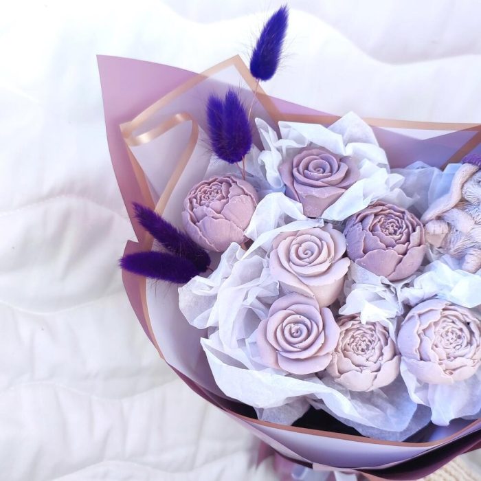 Лента атласная – 1 шт.Упаковка дизайнерская – 2 шт.Лагурус (сухоцвет) – 5 шт.белый бельгийский шоколад callebaut – 9 шт.