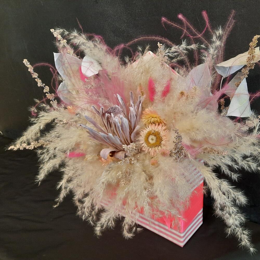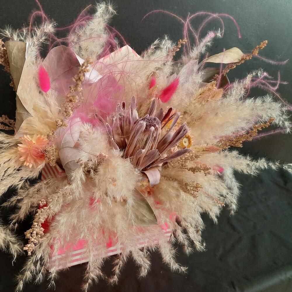 Протея с сухоцветами в шляпной коробке