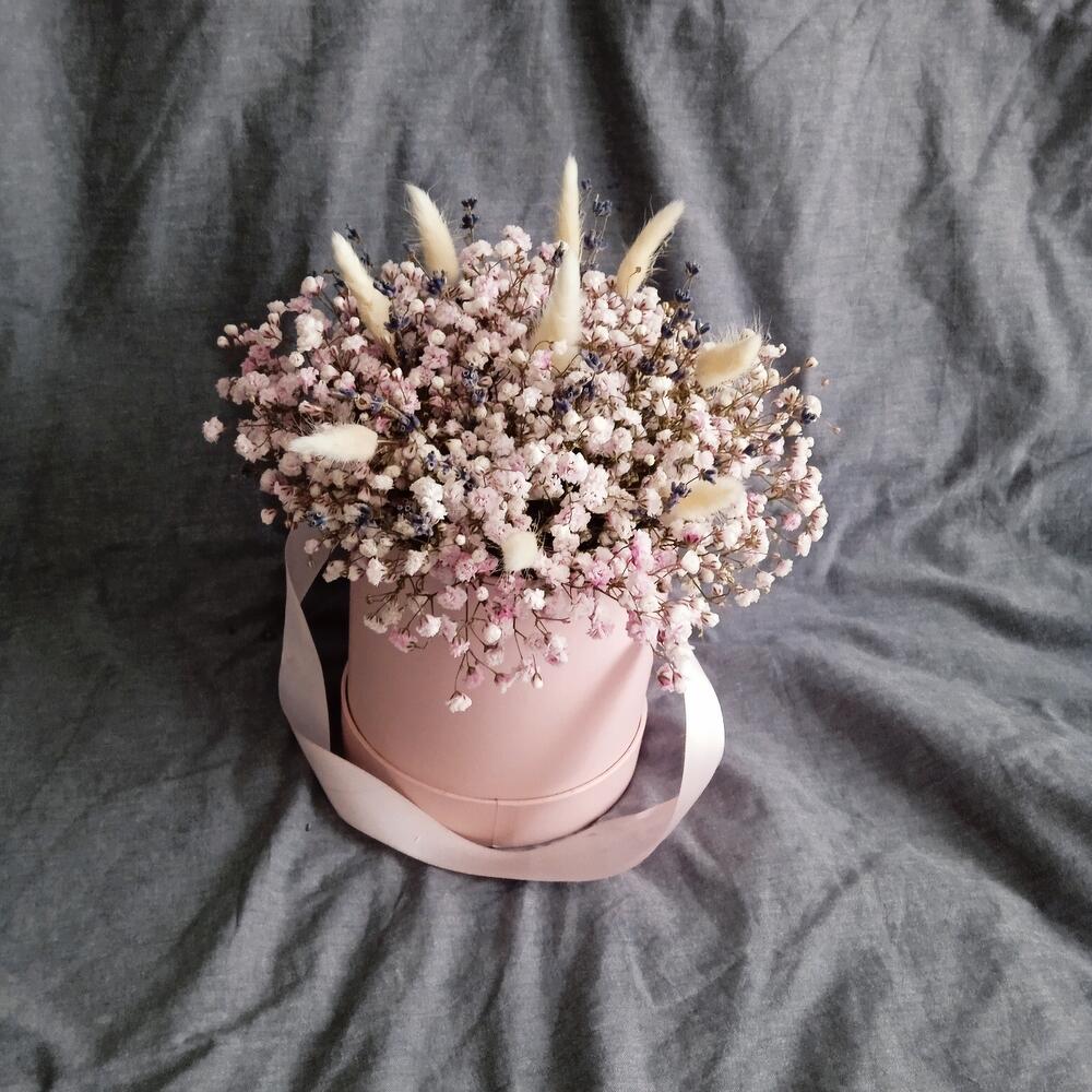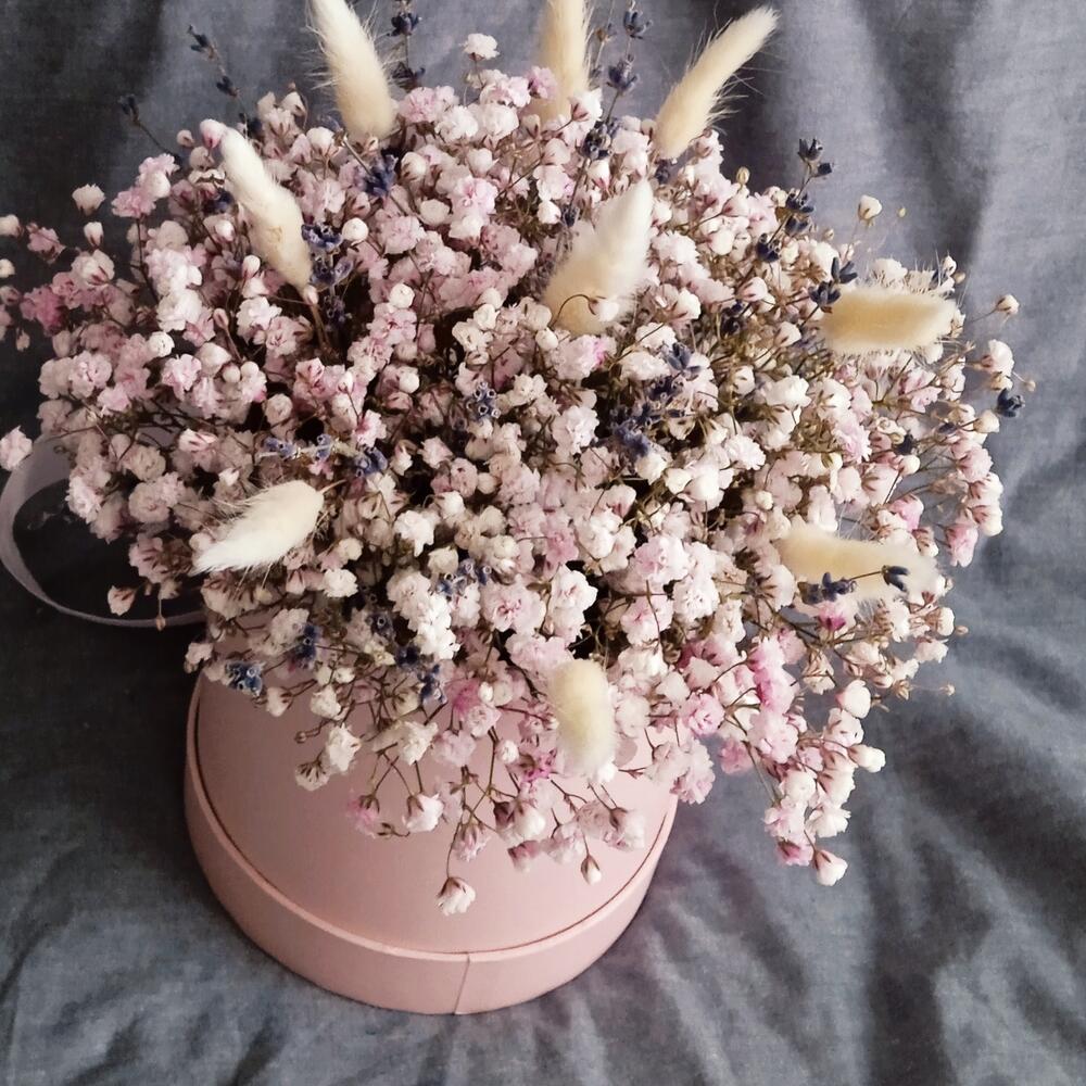 Гипсофила – 25 шт.Лаванда – 35 шт.Шляпная коробка – 1 шт.Лагурус – 9 шт.Флористическая губка – 1 шт.